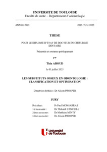 Cette thèse explore les différents types de substituts osseux utilisés en odontologie, leurs propriétés biologiques, mécaniques et physico-chimiques, ainsi que leurs applications cliniques. Elle met en lumière les avantages et limites de ces matériaux, en analysant les stratégies d'optimisation, telles que l'intégration de cellules souches, de facteurs de croissance et de molécules antimicrobiennes, pour améliorer la régénération osseuse et les résultats cliniques ou expérimentaux.